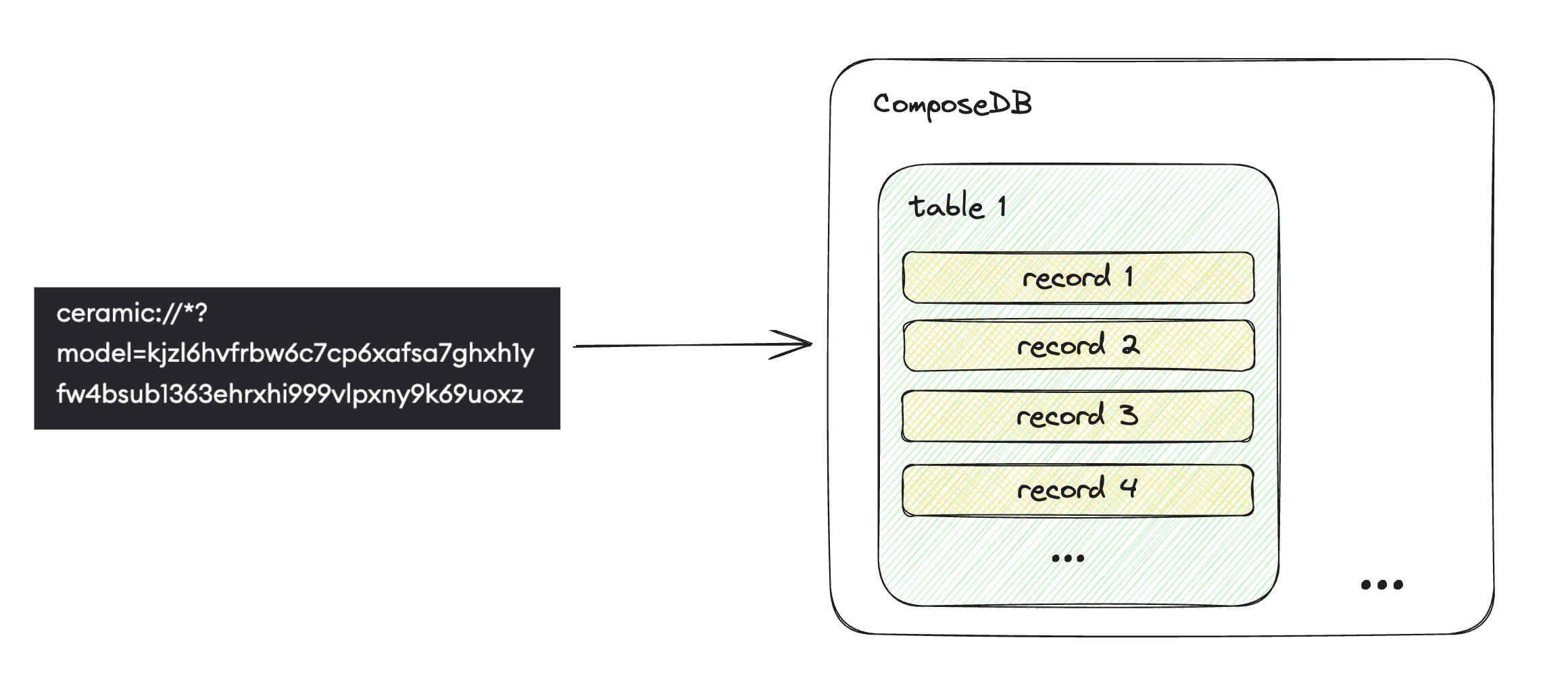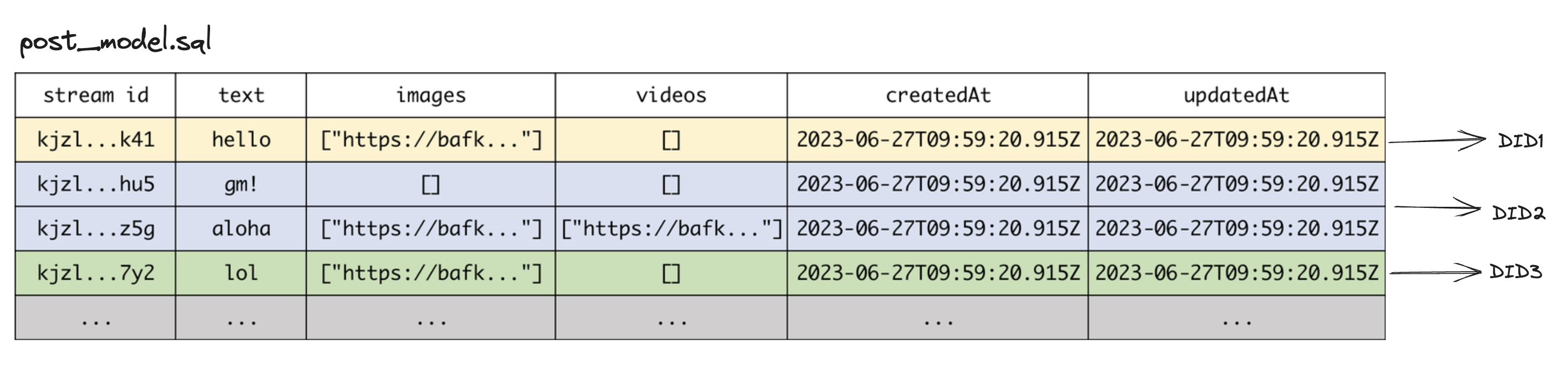 What is different from a traditional database table is that each record belongs to the specific DID who creates it. For example, if you create a data stream under the post model:
