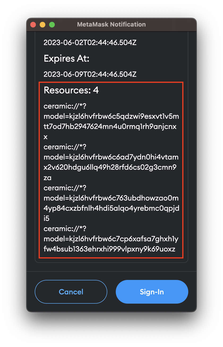 The Resources in this message content specifies the tables in ceramic database that you are giving access to.